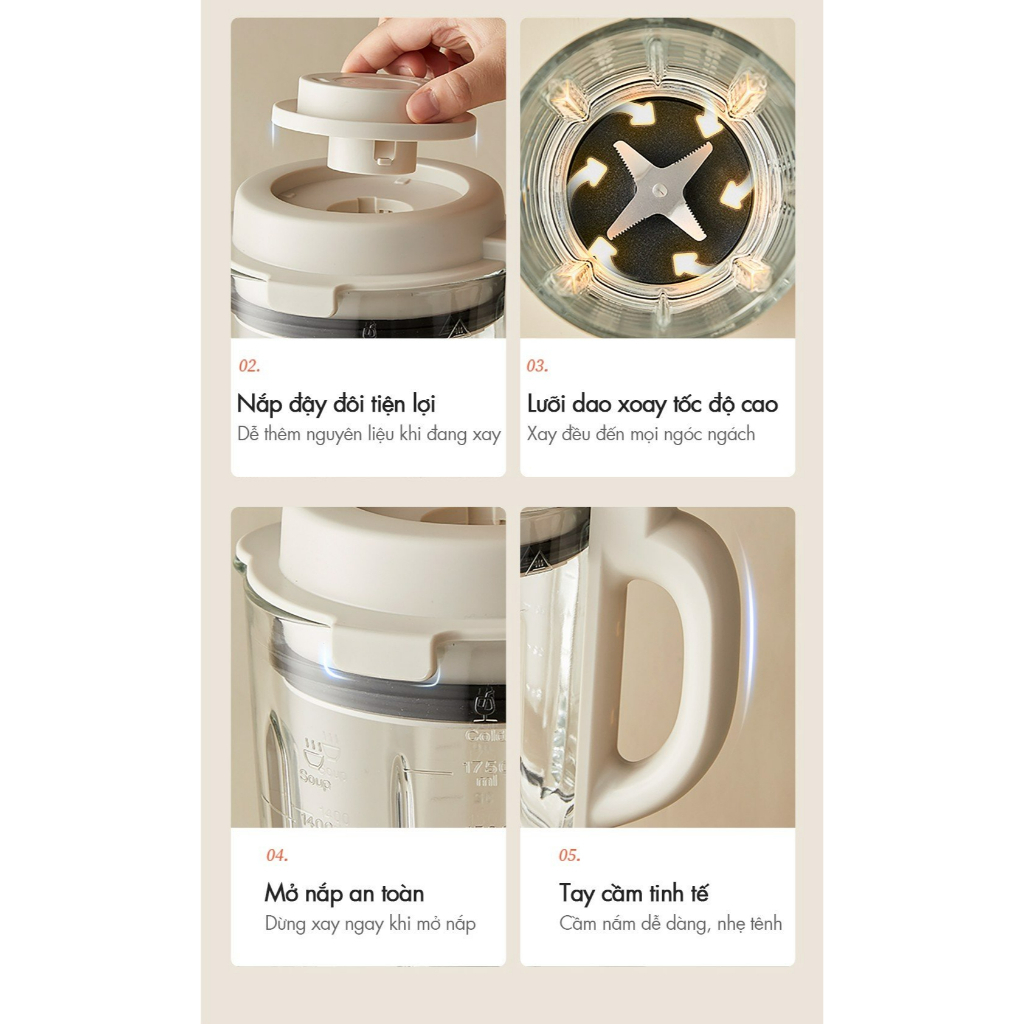 - Công suất: 450 W - Dung tích: 600 ml - Số cối xay: 3 - Công suất mạnh mẽ kết hợp lưỡi dao 4 cánh bằng thép không gỉ giúp xay nhuyễn thực phẩm