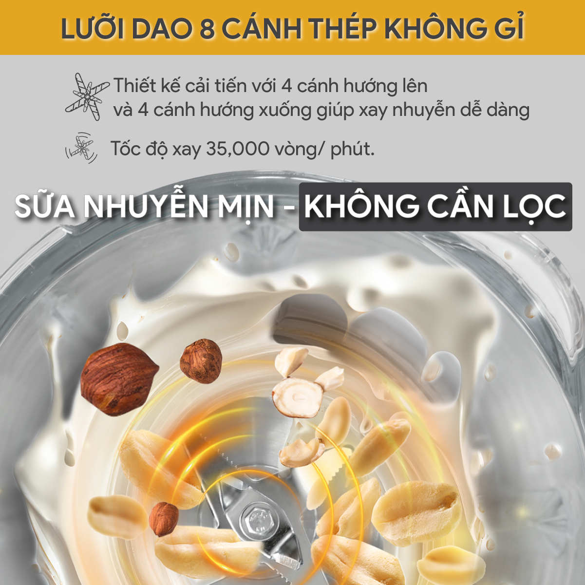 Máy làm sữa hạt BlueStone sở hữu lưỡi dao 8 cánh sắc bén và tốc độ xay 35,000 vòng/phút mang lại hiệu quả xay tối ưu, giúp xay thực phẩm nhuyễn mịn dễ dàng, không thừa cặn.