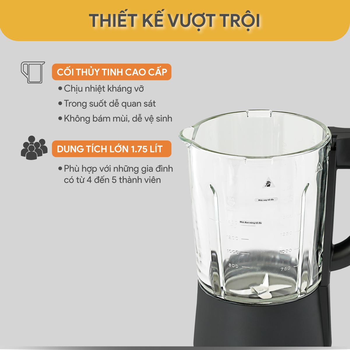 - Công suất: xay 800 W, nấu 800 W - Dung tích: 1.75 lít. - Lưỡi dao bằng chất liệu thép không gỉ với tốc độ xay 35,000 vòng/phút xay nhuyễn mịn tối đa. - Sở
