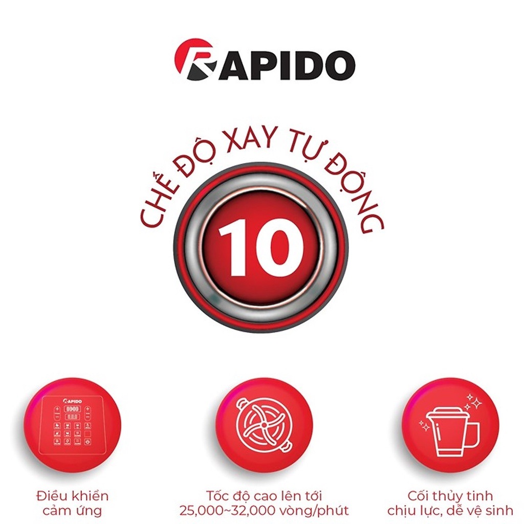 Máy làm sữa hạt Rapido model RHB1800D được sản xuất bằng công nghệ hiện đại CHLB Đức, sử dụng các vật liệu an toàn cho sức khỏe. Thiết kế tinh tế, màu sắc trang nhã, máy làm sữa hạt Rapido chinh phục khách hàng không chỉ bởi sự tiện dụng mà còn là điểm nhấn cho không gian bếp trong gia đình hiện đại. Động cơ 100% đồng nguyên chất, vận hành mạnh mẽ, bền bỉ. Xay nấu nhanh với công suất động cơ 1000W, công suất nhiệt 800W, tốc độ vòng quay 25.000-32.000 vòng/ phút. Cốc đựng bằng chất liệu thủy tinh sang trọng, bền bỉ nhờ cấu tạo chịu nhiệt lên tới 300 độ C, tuyệt đối an toàn cho sức khỏe. Cốc đựng thủy tinh chịu lực tốt, dung tích cốc đựng thủy tinh lên tới 1750ml. Lưỡi dao kép bằng inox 304 có răng cưa sắc bén, chống gỉ, bền bỉ, có khả năng xay nhuyễn mọi loại nguyên liệu một cách dễ dàng. Chức năng an toàn: tự động tắt nguồn khi mở nắp, Chỉ khi cốc thủy tinh được đóng nắp và lắp ráp đúng vị trí thì máy mới hoạt động, nhấc cối xay ra, máy sẽ tự động tắt nguồn, đảm bảo an toàn cho người dùng và bảo vệ tốt cho thiết bị, tăng tuổi thọ máy. Thiết kế sang trọng với bảng điều khiển cảm ứng nhanh nhạy, sử dụng tiếng Việt dễ hiểu, cho bạn tuỳ chỉnh dễ dàng và chính xác hơn. Bảng điều khiển ứng với 7 chức năng nấu tự động cực kì tiện lợi: nấu sữa đậu nành, nấu soup, nấu bột, sinh tố, xay khô, nghiền đá. Tích hợp chức năng làm sạch dễ dàng giúp bạn và gia đình vệ sinh nhanh chóng sau khi sử dụng máy.\    Đi kèm với máy là sách Công thức hướng dẫn làm các món ăn bằng máy: công thức làm sữa hạt, sinh tố, cháo trẻ em, soup, đá xay… Một chiếc máy làm sữa hạt chế biến được vạn món ngon, tốt cho sức khỏe cả gia đình. Ngoài ra máy còn đầy đủ phụ kiện đi kèm.