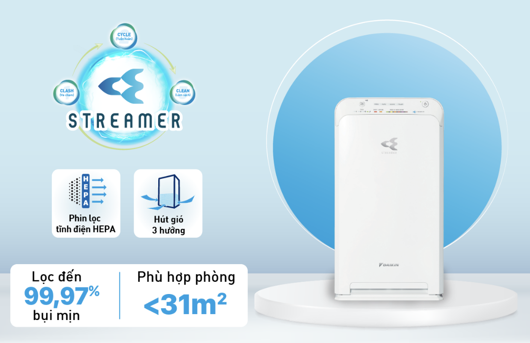 - Làm sạch (Clean): Streamer loại bỏ vi khuẩn bám trên phin lọc bụi và khay nước tạo ẩm. Phin lọc tĩnh điện HEPA lọc bụi hiệu quả hơn nhờ vào lực tĩnh điện, loại bỏ 99.97% các hạt bụi có kích thước 0.3 μm Vượt trội hơn phin HEPA thông thường, phin lọc HEPA của máy lọc khí Daikin được nạp tĩnh điện nên có khả năng lọc không khí tối ưu hơn. Bản thân sợi của phin lọc được nạp tĩnh điện nên có khả năng hút bụi một cách hiệu quả, loại bỏ đến 99.97% các hạt bụi có kích thước nhỏ đến 0.3 µm* với thiết kế hình tháp thông minh, tinh tế nhỏ gọn, màu sắc trang nhã, tăng tính thẩm mỹ cho căn phòng Sản phẩm sở hữu thiết kế dạng tháp, mang lại nhiều ưu điểm vượt trội: