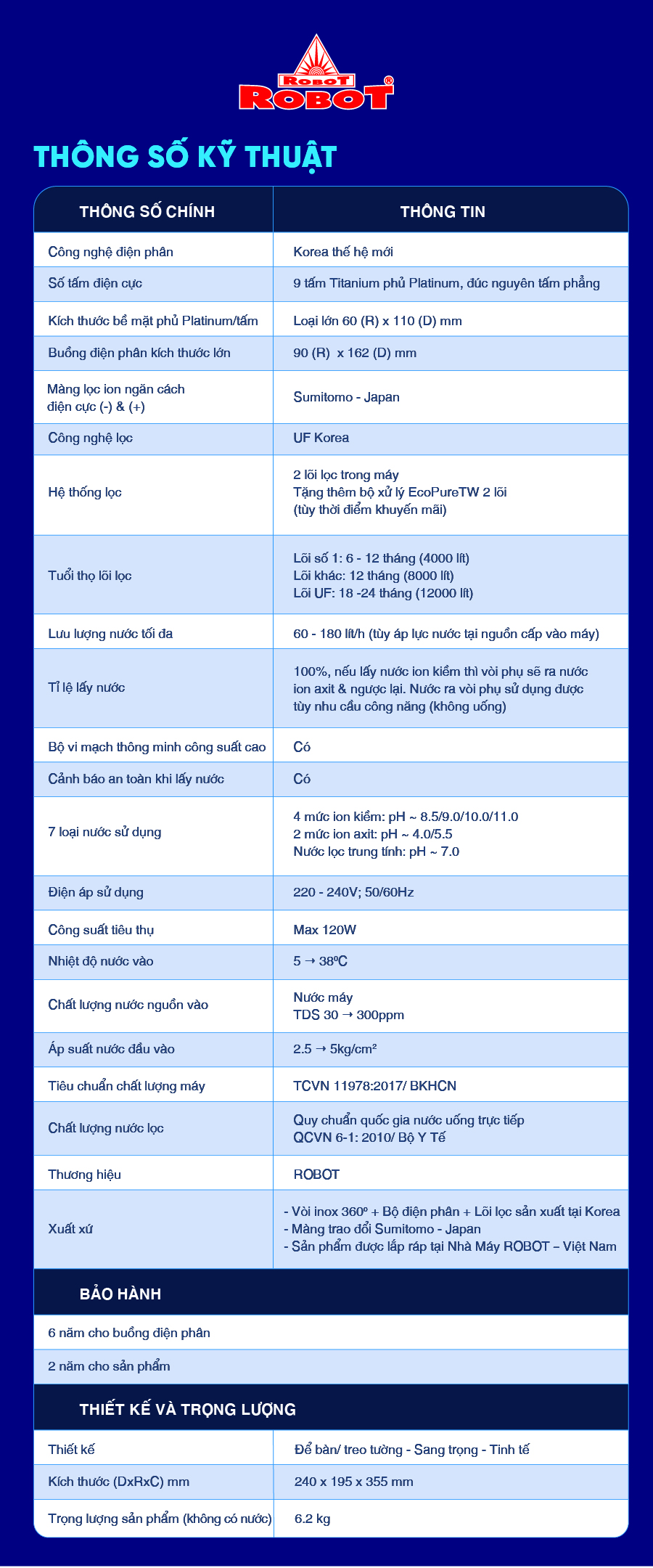 Máy lọc nước điện giải ion kiềm ROBOT ionMega 97 Máy lọc nước điện giải ion kiềm ionMega – thiết kế mới nhất, độc đáo siêu tiết kiệm với đầy đủ công năng của một máy điện giải ion kiềm đạt chuẩn quốc tế. ROBOT ionMega được thiết kế tối giản, nhỏ gọn, thao tác lấy nước trong một lần chạm, đáp ứng nguồn nước điện giải ion kiềm 24/24 tốt cho sức khỏe & sinh hoạt.   Chỉ số Hydrogen, ORP của nước tùy thuộc số tấm điện cực, đặc tính nguồn nước & “điều kiện đo trong phòng thí nghiệm chuyên nghiệp, đạt chuẩn”.