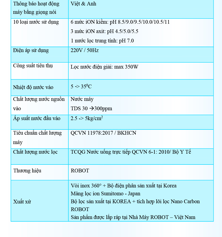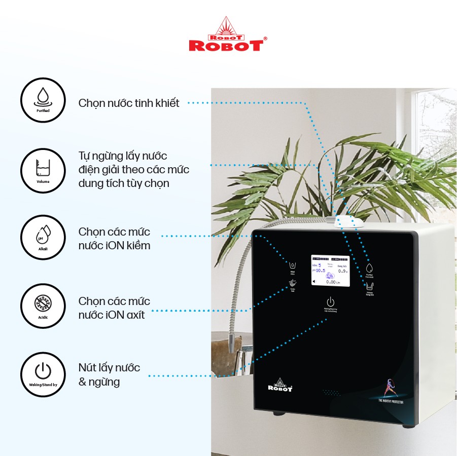 - Hệ thống điều khiển cảm ứng trên mặt phủ kính với màn hình LCD tinh tế ️ Với mong muốn nhiều gia đình Việt có thể sử dụng nước điện giải iON kiềm với chi phí hợp lý để bảo vệ sức khỏe, sắc đẹp & nâng cao chất lượng cuộc sống, ROBOT mang đến sản phẩm “Chất lượng Quốc tế - Giá thành Việt Nam”, phù hợp với mức sống của nhiều người. Tiết kiệm cho người tiêu dùng đến hơn một nửa chí phí so với máy nhập khẩu chỉ từ 30 - 50%, nhưng sở hữu nhiều ưu điểm, tính năng vượt trội, chất lượng cao. Chế độ bảo hành chính hãng, tận nơi, vật tư và linh kiện, lõi lọc luôn có sẵn hạn chế tối đa chi phí sửa chữa, bảo trì. +VĐV Cầu Lông Nguyễn Tiến Minh – tay vợt từng đứng Top 5 Thế Giới chia sẻ: Sau một thời gian sử dụng Máy lọc nước điện giải iON kiềm Minh thấy cải thiện sức khỏe rất nhiều và tốc độ hồi phục sau tập luyện, thi đấu cũng nhanh hơn so với trước đây. Bây giờ mỗi khi đi tập, hay khi đi thi đấu, Minh đều mang theo nước iON kiềm để uống. ROBOT là một thương hiệu Việt Nam uy tín nên Minh hoàn toàn tin tưởng và lựa chọn Máy lọc nước điện giải iON kiềm ROBOT. ️Thông Tin Thương Hiệu CÔNG TY CỔ PHẦN ĐẦU TƯ ROBOT