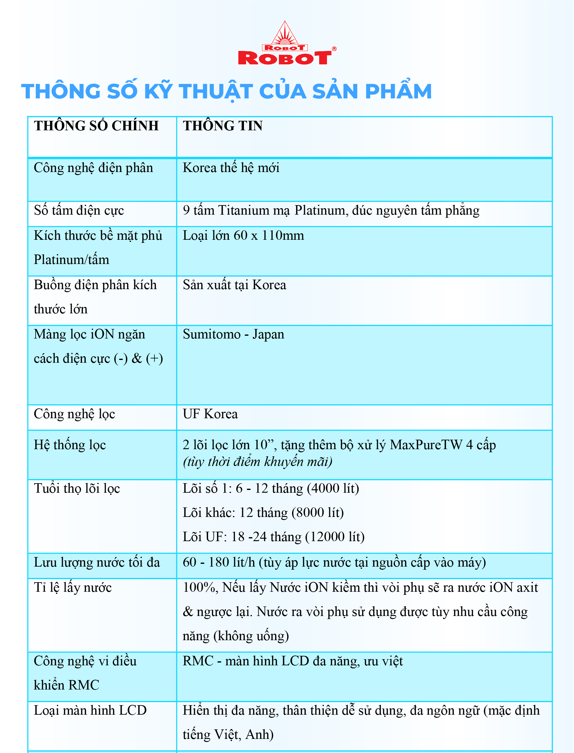 Mua tại TiktokMáy Lọc Nước Điện Giải Ion Kiềm ROBOT IonSmart 911 Nóng Thông Minh - Tạo 11 Loại Nước Máy lọc nước điện giải iON kiềm ROBOT ionSmart 911 là sản phẩm được sản xuất với công nghệ tiên tiến, cao cấp trang bị đến 9 tấm điện cực lớn nhất, có khả năng tạo ra đến 11 loại nước đa chức năng: