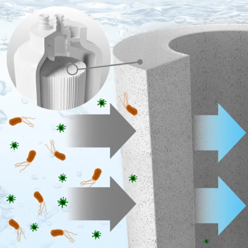 - Hình ảnh chỉ mang tính minh họa. Hiệu suất của lõi lọc UF đã được chứng minh Loại bỏ vi-rút và vi khuẩn Bộ lọc màng siêu lọc sợi rỗng (UF) có kích thước lỗ danh nghĩa là 0,06 - 0,1 μm. Nước xuyên qua thành ngoài và đi đến tâm rỗng của từng sợi vật liệu dạng sợi, và các chất độc hại, vi khuẩn và thậm chí cả vi-rút sẽ bị giữ lại nhờ kích thước lỗ nhỏ của bộ lọc.