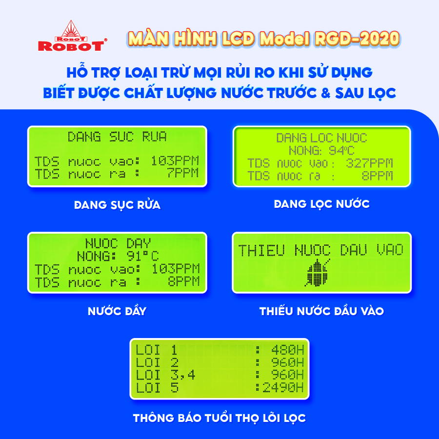• Công nghệ RMC – LCD độc quyền, biết được chất lượng nước trước & sau lọc Bộ vi mạch RMC-LCD thông minh thiết kế phát minh của ROBOT, mọi chi tiết vận hành máy được hiển thị trên màn hình LCD, cảnh báo mọi rủi ro cho người sử dụng   Tuổi thọ lõi lọc được tính theo lưu lượng nước sử dụng, không tính theo thời gian ghim điện như các máy thông thường, tiết kiệm tối đa chi phí thay lõi lọc.
