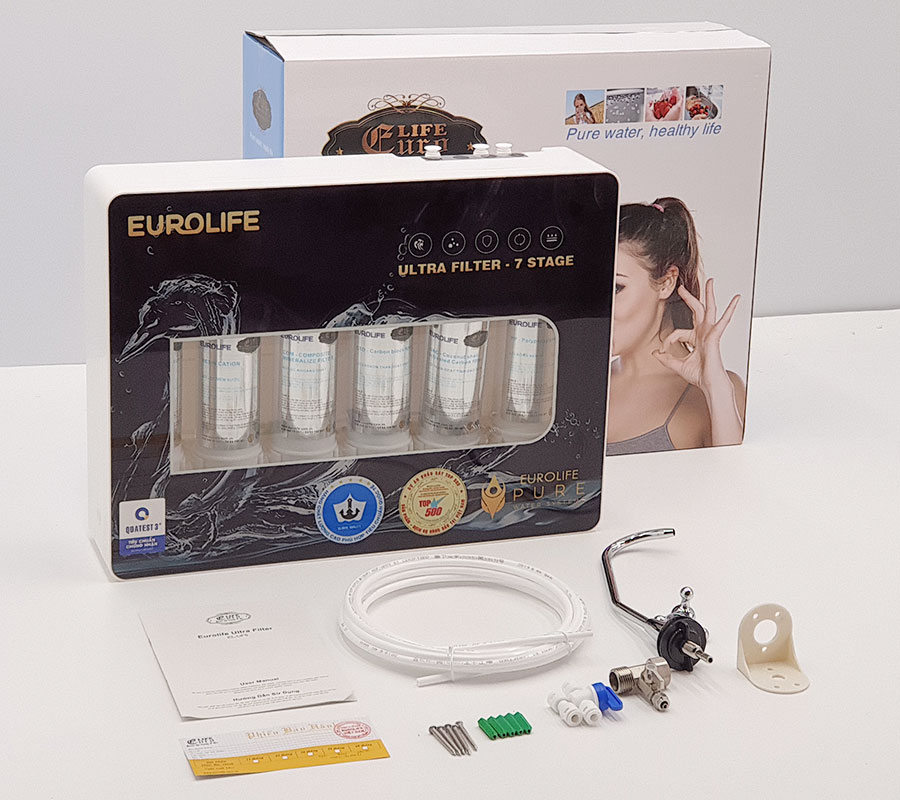 - Lõi Resin ( Lọc mềm) Chức năng: được cấu tạo từ hạt nhựa trao đổi Ion Cation, lõi lọc có khả năng loại bỏ kim loại nặng, chất tẩy rửa, chất hữu cơ và các hoá chất độc hại. Ngoài ra lõi lọc còn có khả năng trao đổi Ion, giữ lại các yếu tố làm nước cứng gây tắc màng như Ca, Mg,.. THIẾT KẾ VƯỢT TRỘI Máy lọc nước Eurolife EL-UF7 được thiết kế với 7 lõi lọc, được định vị chắc chắn trong Panel bằng nhựa PVC cao cấp và mặt kiếng sáng bóng dễ dang lau chùi vệ sinh. Mặt sau được thiết kế với 2 khoen treo đơn giản, dễ dàng lắp đặt. Máy có 3 đầu kết nối : Nước cấp vào, nước xả thải và nước đã lọc. Được phân biệt rõ ràng, dễ kết nối Bạn có thể lắp ngay dưới gầm chậu rửa chén để tiết kiệm không gian và tiện dụng hơn. PHỤ KIỆN ĐI KÈM Phụ kiện kèm Máy lọc nước uống trực tiếp 5 cấp độ lọc Eurolife EL-UF5 bao gồm: Thân máy đã lắp lõi lọc 01; Vòi và phụ kiện 01; Van nối dây và vòi nước ra 01; Ống dẫn nước 04m; Bát gắn vòi 01; Hướng dẫn sử dụng 01; Bộ chia đầu vào 01; Phiếu bảo hành 01; Ốc vít 05; Van khóa 01. Sản phẩm được đi kèm với vòi xả cùng các van đấu nối. LẮP ĐẶT ĐƠN GIẢN Sản phẩm không thể thiếu cho mỗi căn bếp Việt ! Hãy chăm lo sức khỏe của người thân và gia đình của bạn ngay hôm nay, bắt đầu từ nguồn nước thuần khiết mà Eurolife sẽ mang lại cho bạn. Hãy trải nghiệm cùng sản phẩm thương hiệu Eurolife để cảm nhận giá trị chúng tôi mang lại cho khách hàng. Chất lượng, uy tín và dịch vụ hậu mãi tốt luôn là cam kết của chúng tôi. CHẤT LƯỢNG HÀNG ĐẦU Thương hiệu Eurolife Việt Nam là một thương hiệu uy tín hàng đầu trên thị trường Việt Nam với 12 năm kinh nghiệm Các sản phẩm Eurolife đạt nhiều chứng chỉ uy tín trong nước như :