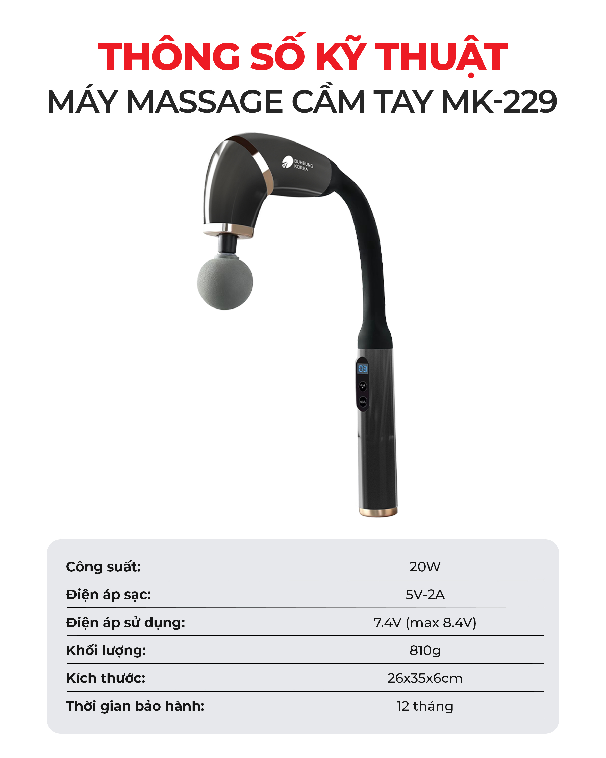 ✨Máy massage cầm tay Buheung MK-229, thiết kế công thái học, 4 đầu massage, BH chính hãng 12 tháng