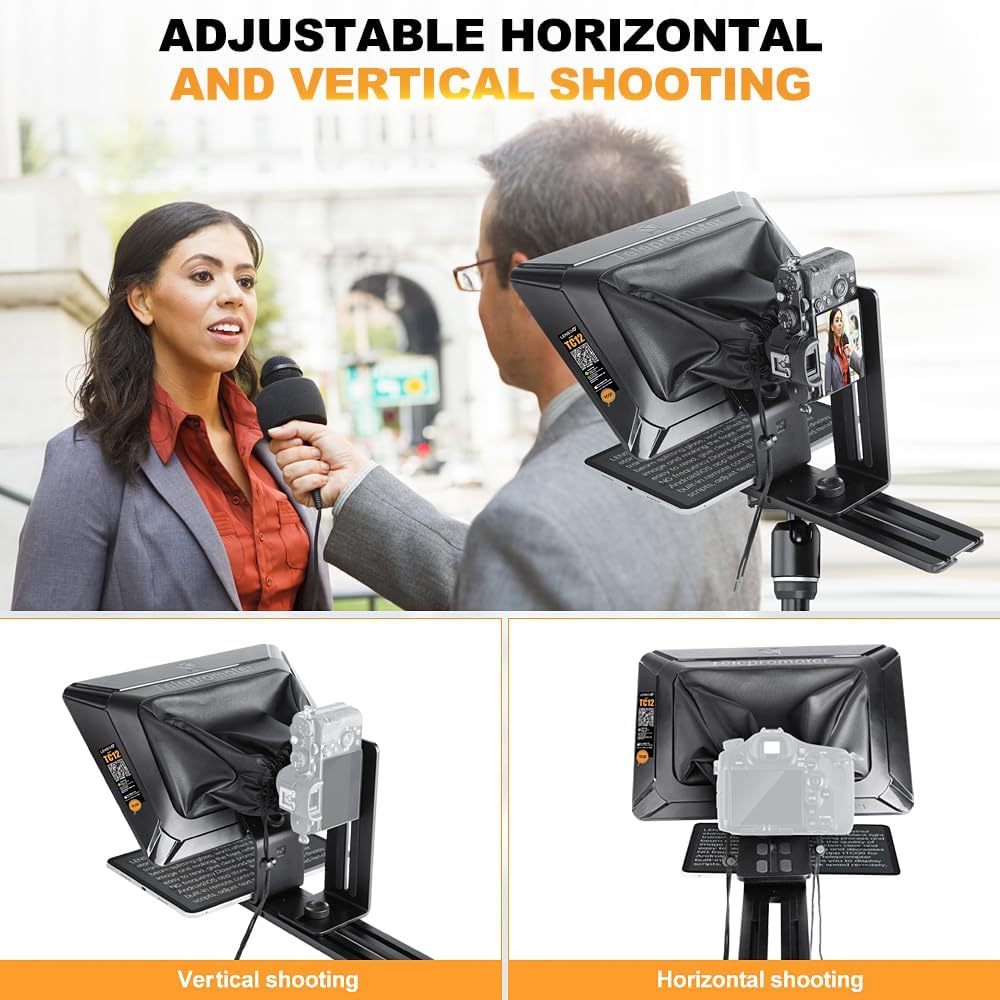 Máy nhắc chữ Lensgo TC12 thiết kế chắc chắn cứng cáp từ hợp kim nhôm, tháo lắp dễ dàng, kính phân tách chùm tia trong suốt 12 inch, khả năng truyền sáng 70% giúp phản chiếu rõ nét, hỗ trợ chụp ngang/ dọc với góc chụp rộng, tương thích với nhiều dòng máy tính bảng cỡ lớn, nhắc chữ thông qua ứng dụng với điều khiển bluetooth, thích hợp để phỏng vấn, làm vlog, quay phát trực tiếp,...