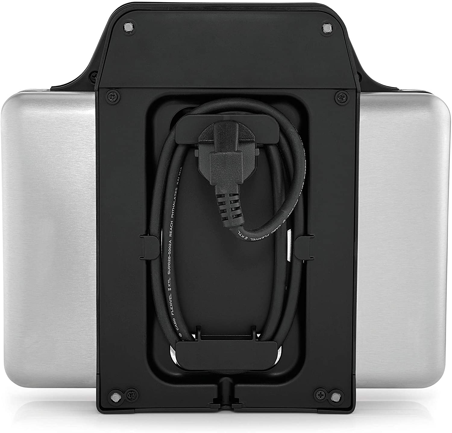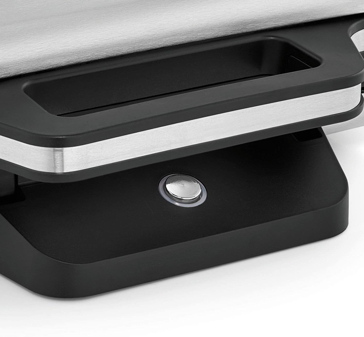 - Khóa tay cầm biến đổi với hai cấp độ điều chỉnh chiều cao thích ứng với độ dày của từng miếng bánh sandwich, đảm báo bánh sẽ được nướng đều và không bị cháy