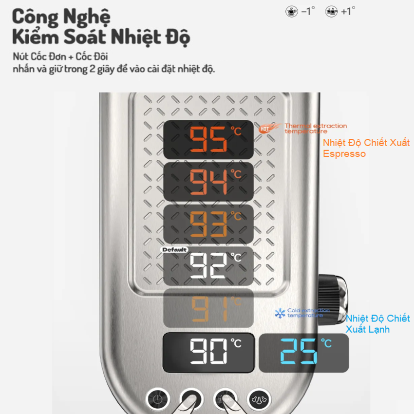 - Linh hoạt kiểm soát nhiệt độ pha chiết suất cà phê 90~95ºC