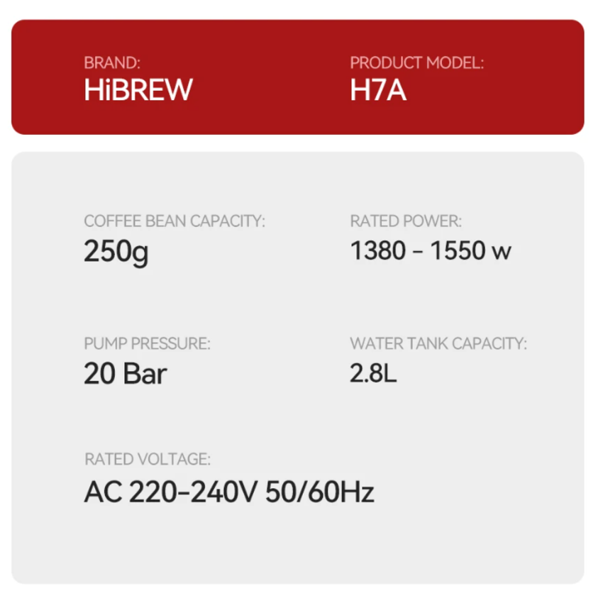 - Máy pha cà phê Espresso chuyên nghiệp 3 trong 1 HiBREW H7A có công suất hoạt động là 3000W, áp suất 20 bar cho phép pha tối đa 50 -60 ly/ngày. Nhờ đó đáp ứng được nhu cầu sử dụng tại các văn phòng, quán cà phê, khách sạ Công nghệ xay cảm biến hiện đại