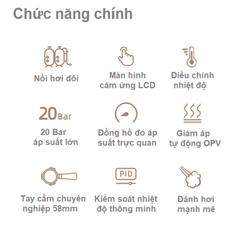 - Chức năng pha cà phê: Cappuccino, Espresso, Latte