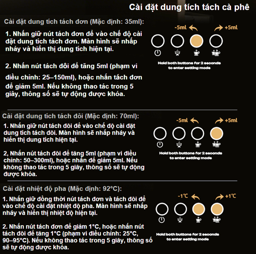 - Điều chính nhiệt độ chiết xuất: 25ºC; 90ºC-95ºC