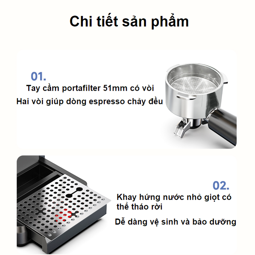 - Bộ phụ kiện bao gồm: 1 máy chủ; 1 tay pha 51mm ; x2 phin lọc inox ; 1 tay nén kiêm thìa; 1 phễu định lượng; 1 sách HDSD