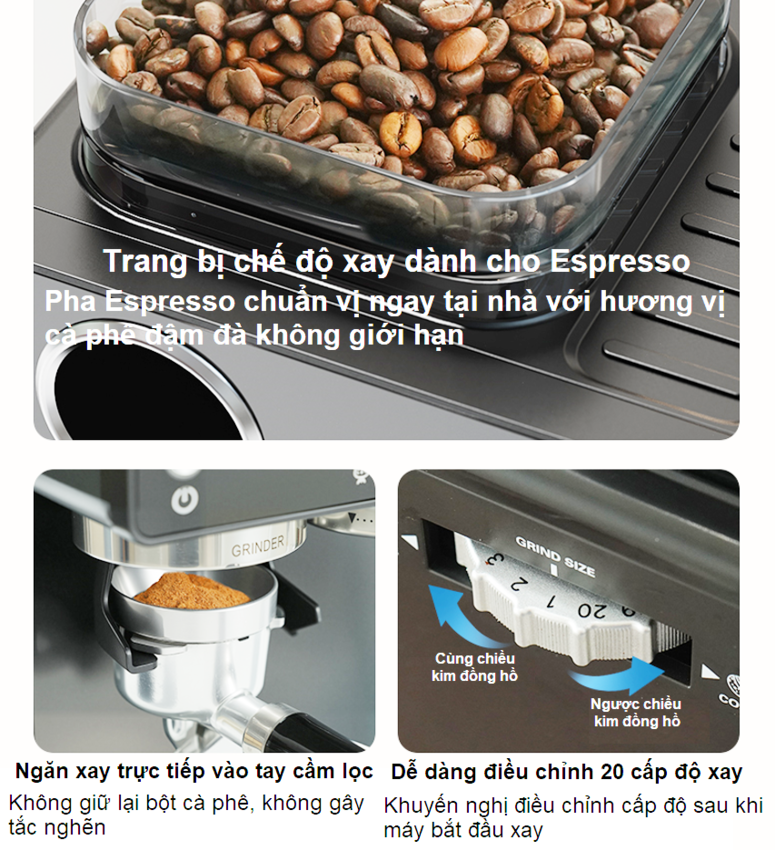 - Tiện ích xay và pha cà phê trên 1 sản phẩm (Pha 3 trong 1, xay 20 chế độ)