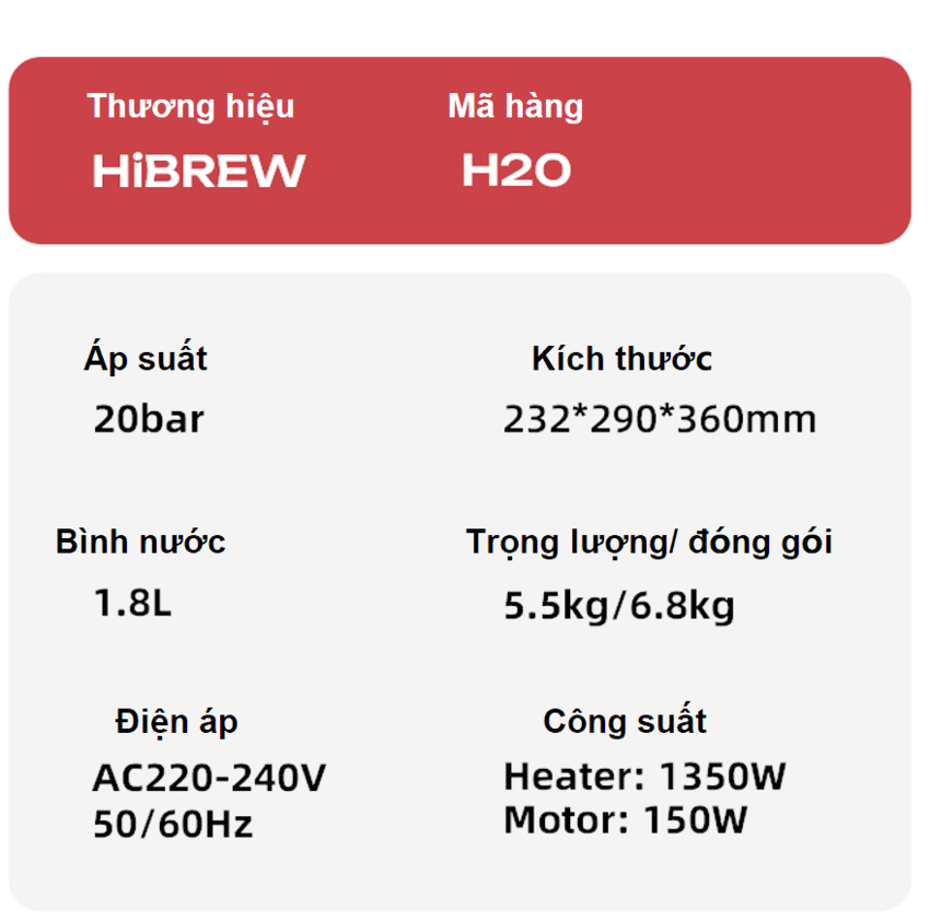 - Máy pha cà phê Espresso 3 trong 1 HiBREW H20 có công suất hoạt động là 1500W, áp suất 20 bar cho phép pha tối đa 30-35 ly/ngày. Nhờ đó đáp ứng được nhu cầu sử dụng tại các văn phòng, gia đình... Hệ thống gia nhiệt NTC" và cảm biến nhiệt độ "PID" tiên tiến