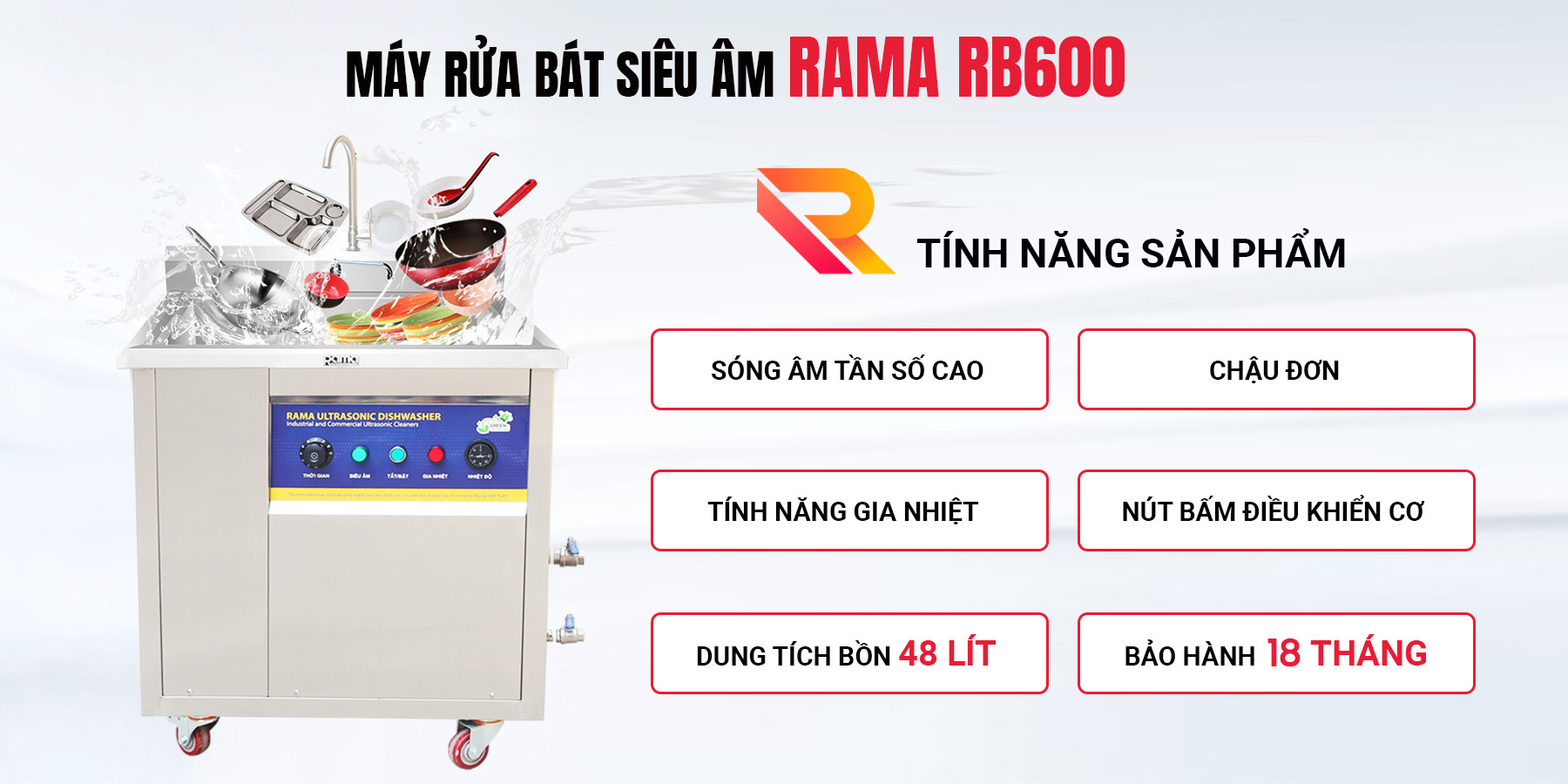 - Dung tích bồn rửa : 48L Ứng dụng thực tế Bằng việc làm sạch hiệu quả với công nghệ sóng siêu âm, máy rửa bát sóng siêu âm Rama RB600 phù hợp để: