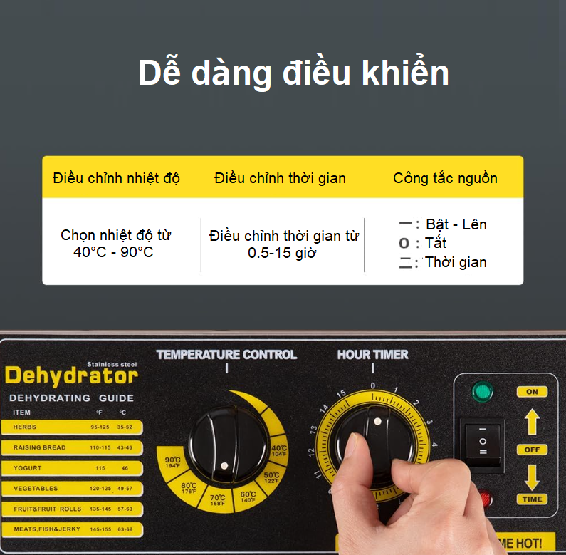 - Hệ thống gia nhiệt tự động 360 độ vòng quanh cho 16 khay lưới inox, giúp thực phẩm được sấy chuyên nghiệp rất đều và thơm ngon.