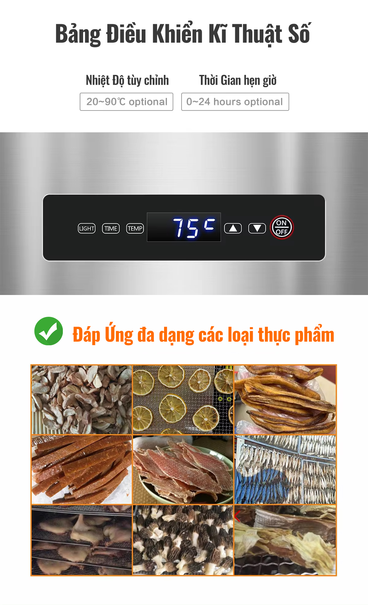 Máy Sấy Thực Phẩm HTG 20/24 Khay, Hẹn Giờ Đến 24 Tiếng, Nhiệt Độ 30-90ºC, Chất Liệu Inox 2 Lớp
