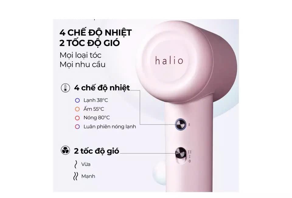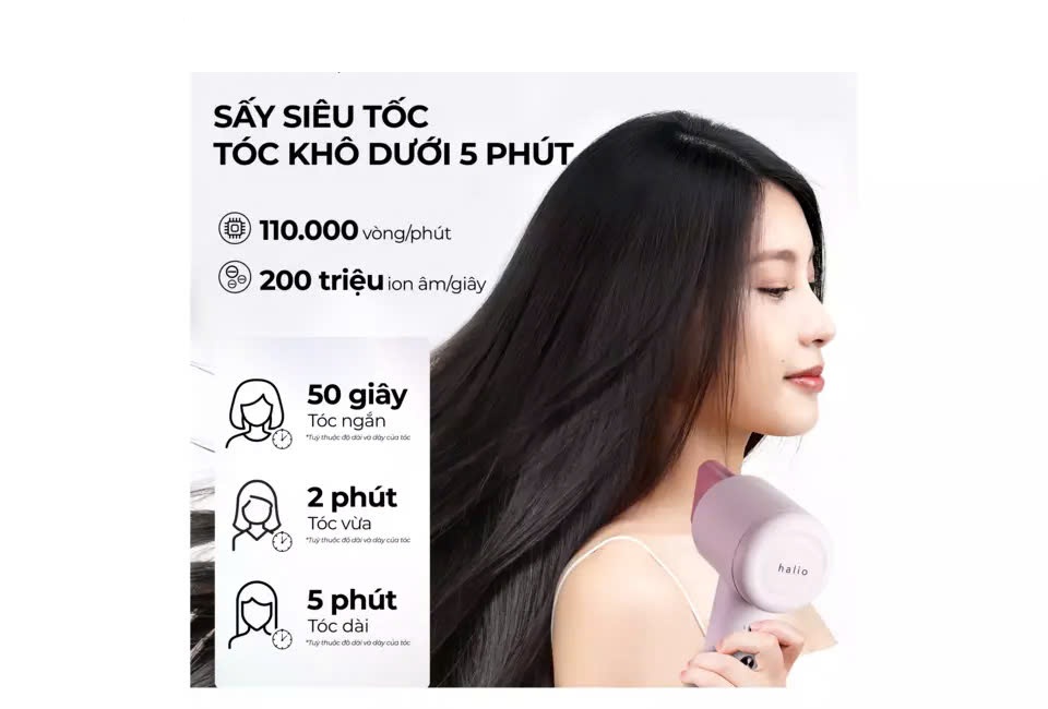 Cùng khám phá máy sấy Halio High Speed Ionic được trang bị động cơ mạnh mẽ với tốc độ lên đến 110,000 vòng/phút giúp tóc khô nhanh gấp đôi so với các loại máy sấy tóc thông