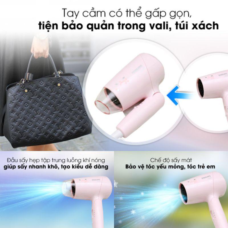 Thiết kế nhỏ gọn với công suất 1200W Máy sấy tóc Philips BH010 sở hữu thiết kế nhỏ gọn, tay cầm của máy có thể gấp gọn, thuận tiện cho vào vali túi xách khi đi