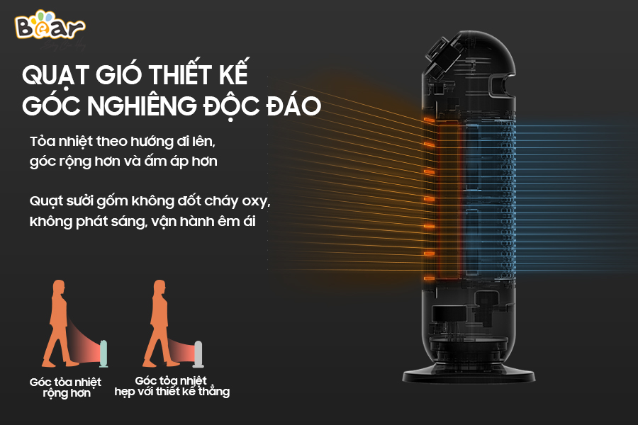 Việc sử dụng máy sưởi sử dụng đèn halogen gây ra tình trạng khô da, đốt cháy oxy làm người sử dụng khó thở, đây là nỗi ám ảnh của nhiều gia đình. Công nghệ sưởi gốm có trong quạt sưởi gốm Bear DNQ-C20B1 chính là nâng cấp đáng giá bậc nhất. Bên cạnh đó, quạt gió được thiết kế góc nghiêng độc đáo, tỏa nhiệt rộng hơn và ấm hơn mà không đốt oxy, không gây khô da.