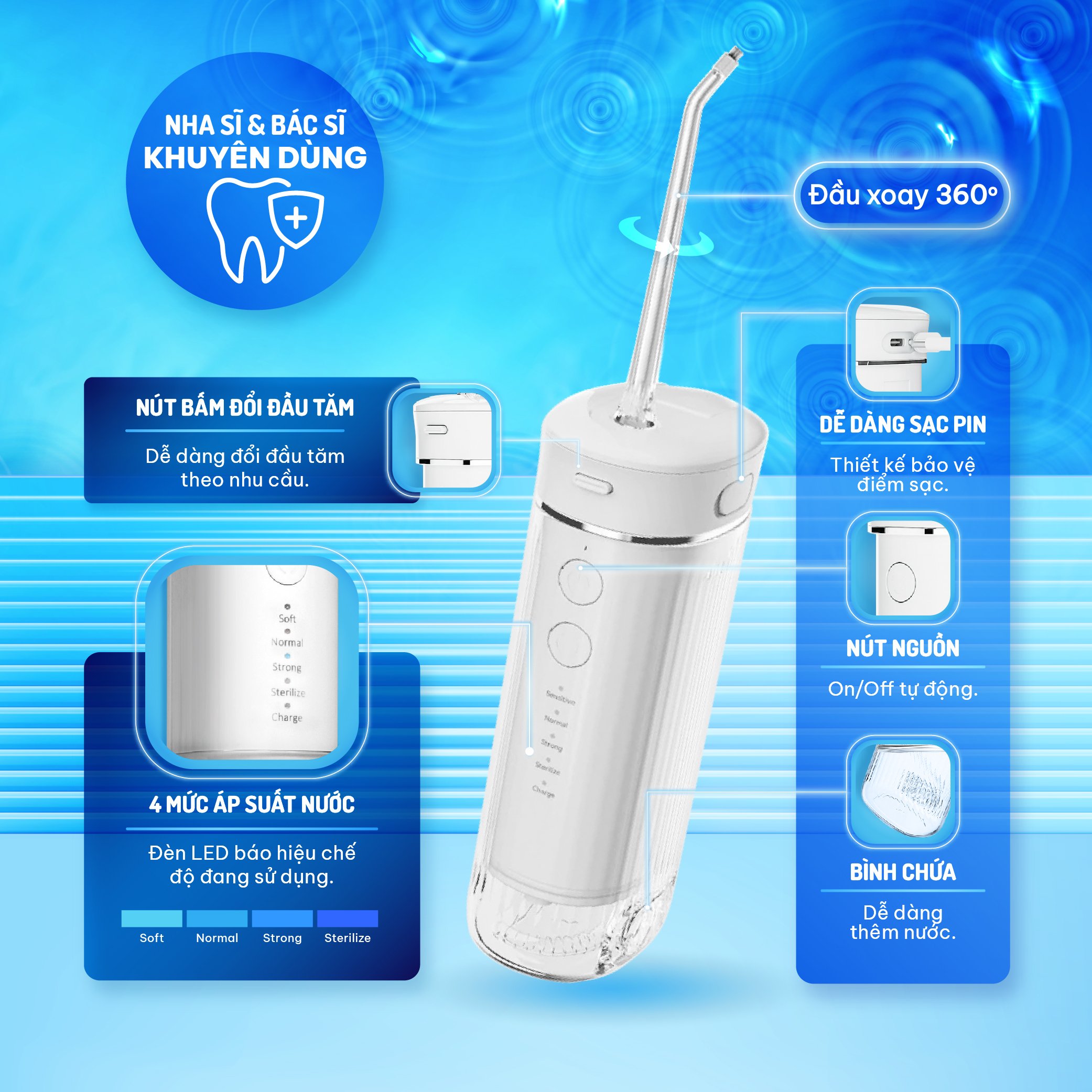 • Màn hình hiển thị 5 chế độ hoạt động: mạnh, trung bình, nhẹ, ngắt quãng, xịt tại chỗ. Kết hợp tiên tiến giữa áp lực nước và xung lực 1800 lần phun/ phút loại bỏ đến 99,99% mảnh vụn thức ăn bám dính giữa các kẽ răng, giúp vệ sinh và chăm sóc răng miệng tối ưu. Chức năng bộ nhớ thông minh sẽ ghi nhớ chế độ mà bạn sử dụng lần trước để tiếp tục thực hiện trong lần dùng sau khi bạn nhấn nút “MODE”.   Dung tích bình chứa 225ml hạn chế việc gián đoạn khi sử dụng và thuận tiện khi vệ sinh. Sản phẩm có thiết kế chống nước IPX7 và có thể được làm sạch trực tiếp dưới vòi nước. Đèn báo thông minh hiển thị màu đỏ khi đang sạc và chuyển sang màu trắng khi sạc đầy.  Thiết bị sẽ tự động tắt sau 2 phút hoạt động. Dung lượng pin lithium 1100mAh 3.7V lớn, sạc đầy khoảng 5 giờ để sử dụng liên tục trong 50 phút. Phụ kiện sản phẩm