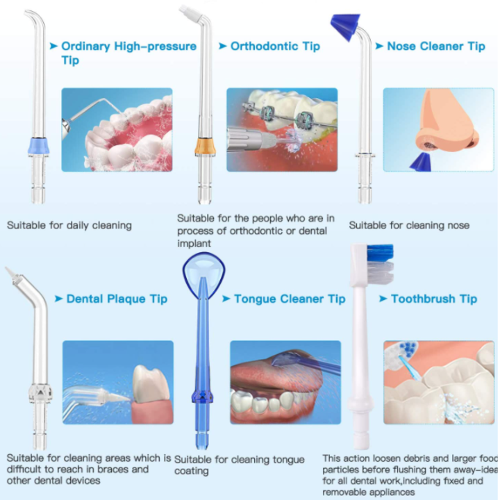 - Đầu xịt được thiết kế giúp làm sạch răng một cách hiệu quả, đưa đầu xịt đến đúng vị trí kẽ răng khi sử dụng Tính năng nổi bật - Có 5 chế độ hoạt động: Nhẹ (Soft), Thấp (Low), Trung bình (Medium), Cao (High), Siêu cao (Super High). - Có 08 đầu cho các mục đích rửa khác nhau như - Dung lượng pin lớn 2150mA
