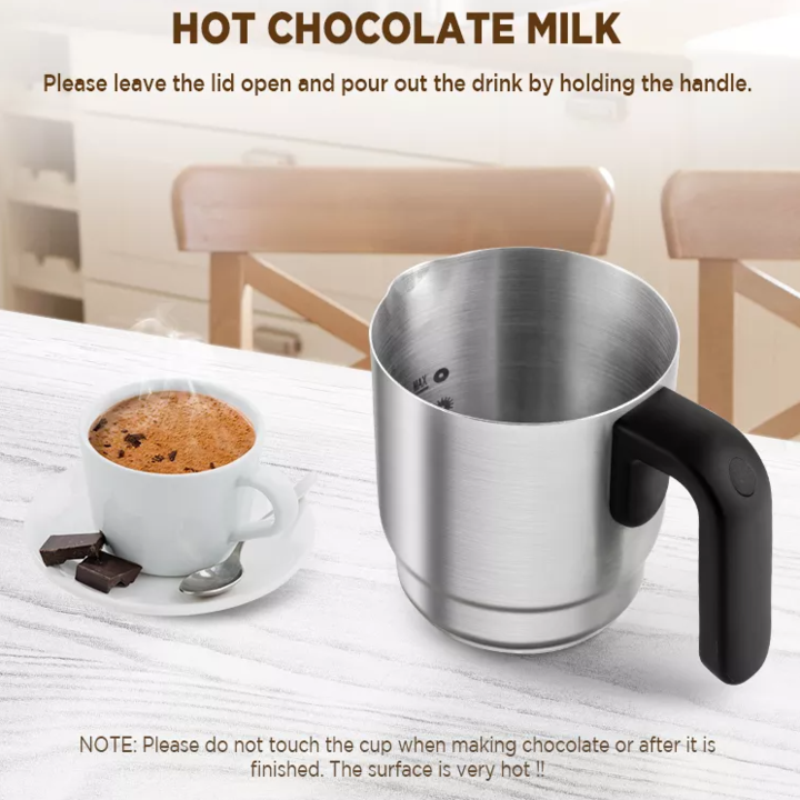 - Máy tạo bọt sữa được làm bằng inox cao cấp 304, dày dặn; siêu bền bỉ và hoàn toàn chống han gỉ. Bề mặt inox được phủ thêm lớp chống dính giúp bạn dễ dàng vệ sinh. Thanh khuấy inox siêu bền