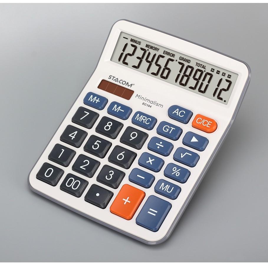 Máy Tính Stacom Ec104 Thuộc dòng máy tính cầm tay cỡ lớn, màn hình hiển thị lớn với 12 số. Hai nguồn điện cung cấp từ năng lượng ánh sáng và pin giúp máy luôn