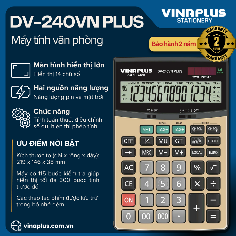 TÍNH NĂNG NỔI BẬT Máy tính Vinaplus DV-240VN PLUS sở hữu thiết kế to với màn hình hiển thị lớn, phục vụ nhiều nhu cầu tính toán khác nhau. Chức năng nổi bật như tính tỷ lệ phần trăm, tăng giá, tính thuế, đổi tỷ giá giúp bạn hoàn thành nhanh chóng các công việc cần tới sự tính toán với các bước tính ngắn và chuẩn xác nhất.