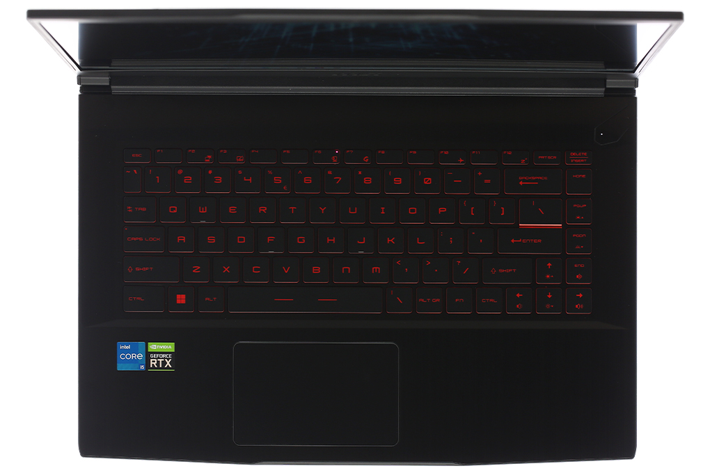 Toàn thân MSI GF63 có màu đen chủ đạo với những điểm nhấn màu đỏ như logo MSI. Phần quạt thông gió hình chữ X ẩn dưới thân máy, tạo nên sự thanh thoát và liền khối trong thiết kế tổng thể.