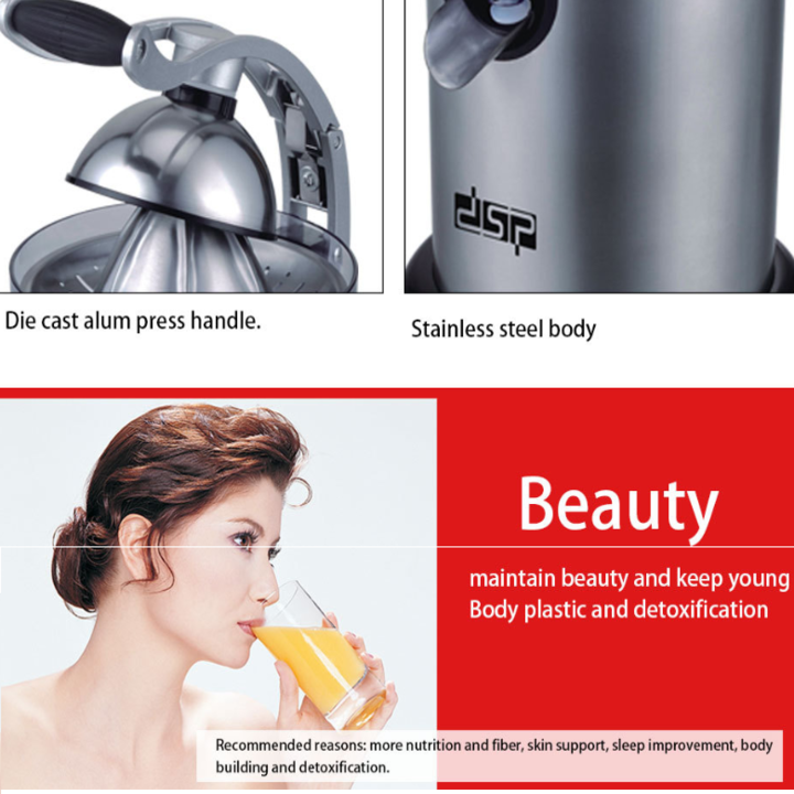 Máy vắt cam DSP thiết kế đơn sang trọng và tiện ích, thích hợp dùng để vắt lấy nước các loại trái cây như cam, quýt, chanh… - Công suất : 130W (công suất lớn nhất