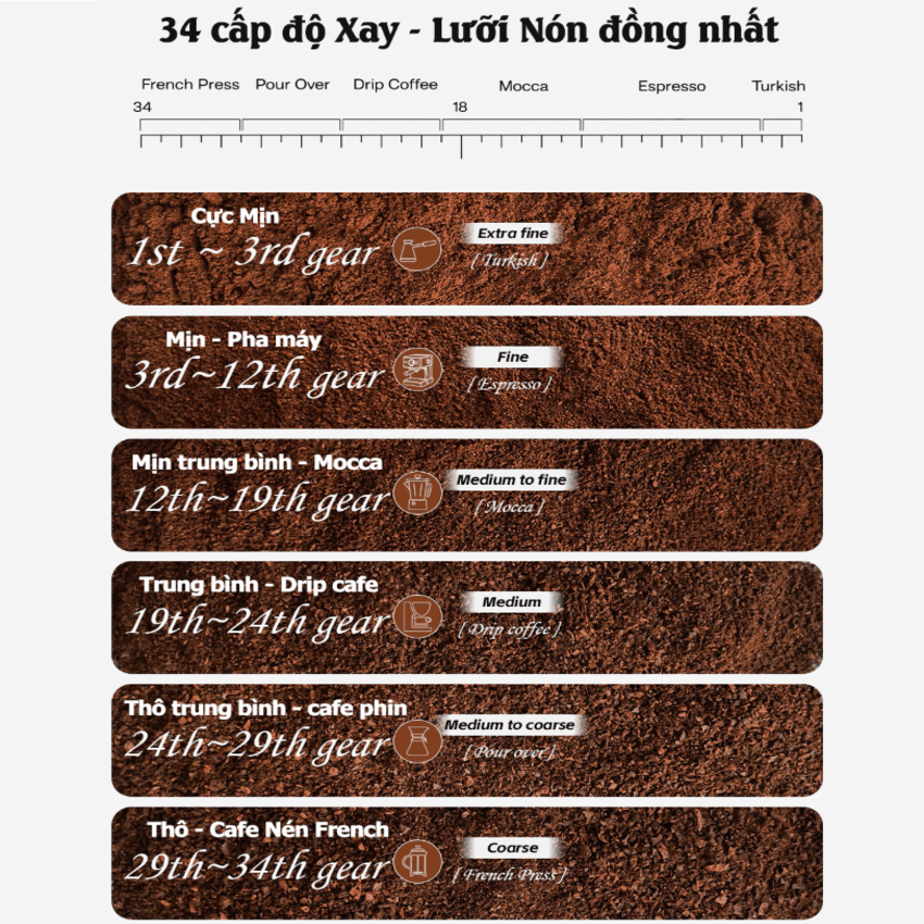 - Với lưỡi dao chất liệu thép không gỉ SS420 bền bỉ bền bỉ sở hữu 34 cấp độ xay, từ dạng thô đến dạng mịn. Chính vì thế nó có thể đáp ứng tối thiểu độ mịn cho 1 ly cà phê espresso chuẩn Ý. Thông số kỹ thuật