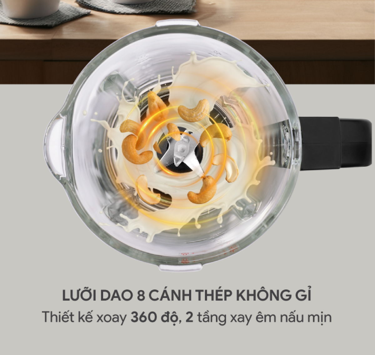 - Lưỡi dao bằng chất liệu thép không gỉ với tốc độ xay 35,000 vòng/phút xay nhuyễn mịn tối đa.