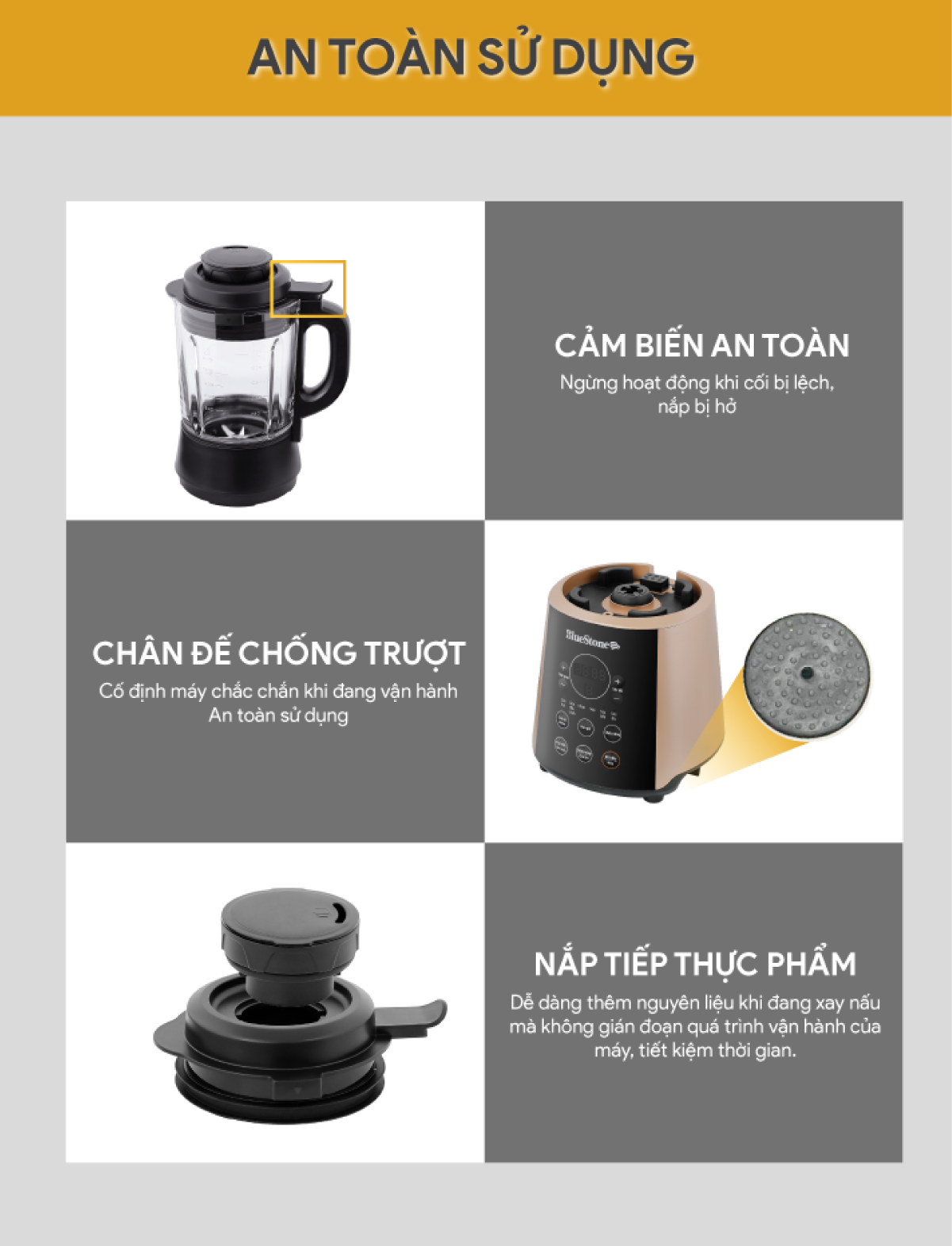 - An toàn: Thiết kế chân đế chống trượt, giữ cho máy đứng thẳng, ổn định, không bị ngã nghiêng trong khi máy hoạt động, tự động ngắt khi máy hoạt động quá nhiệt, máy chỉ hoạt động khi lắp đúng khớp cối.