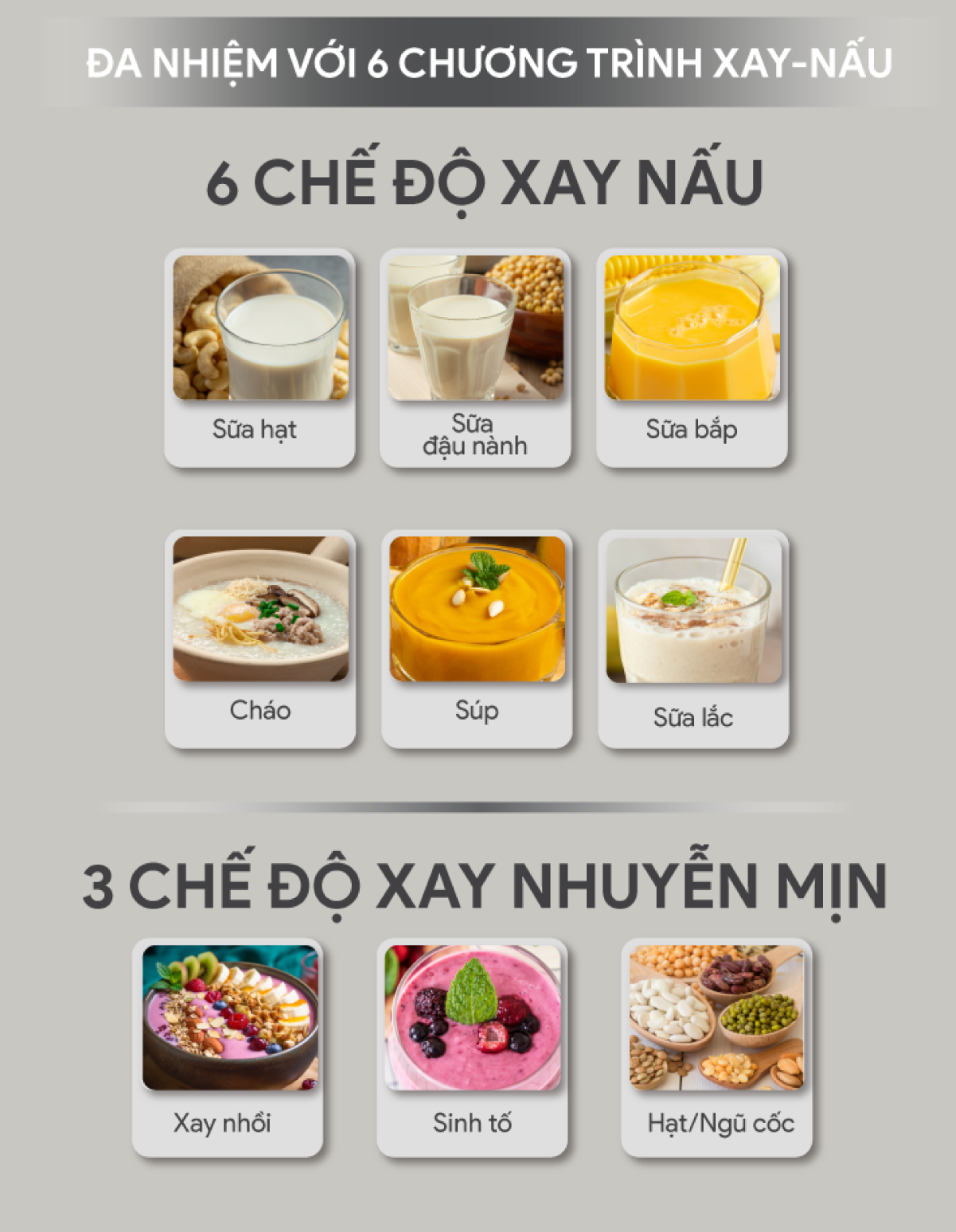 - Sở hữu 9 chức năng nấu được cài sẵn sinh tố detox, cháo, súp, sữa đậu nành, sữa bắp, sữa hạt, sữa lắc, làm sạch, giữ ấm đáp ứng đa dạng nhu cầu của người dùng.