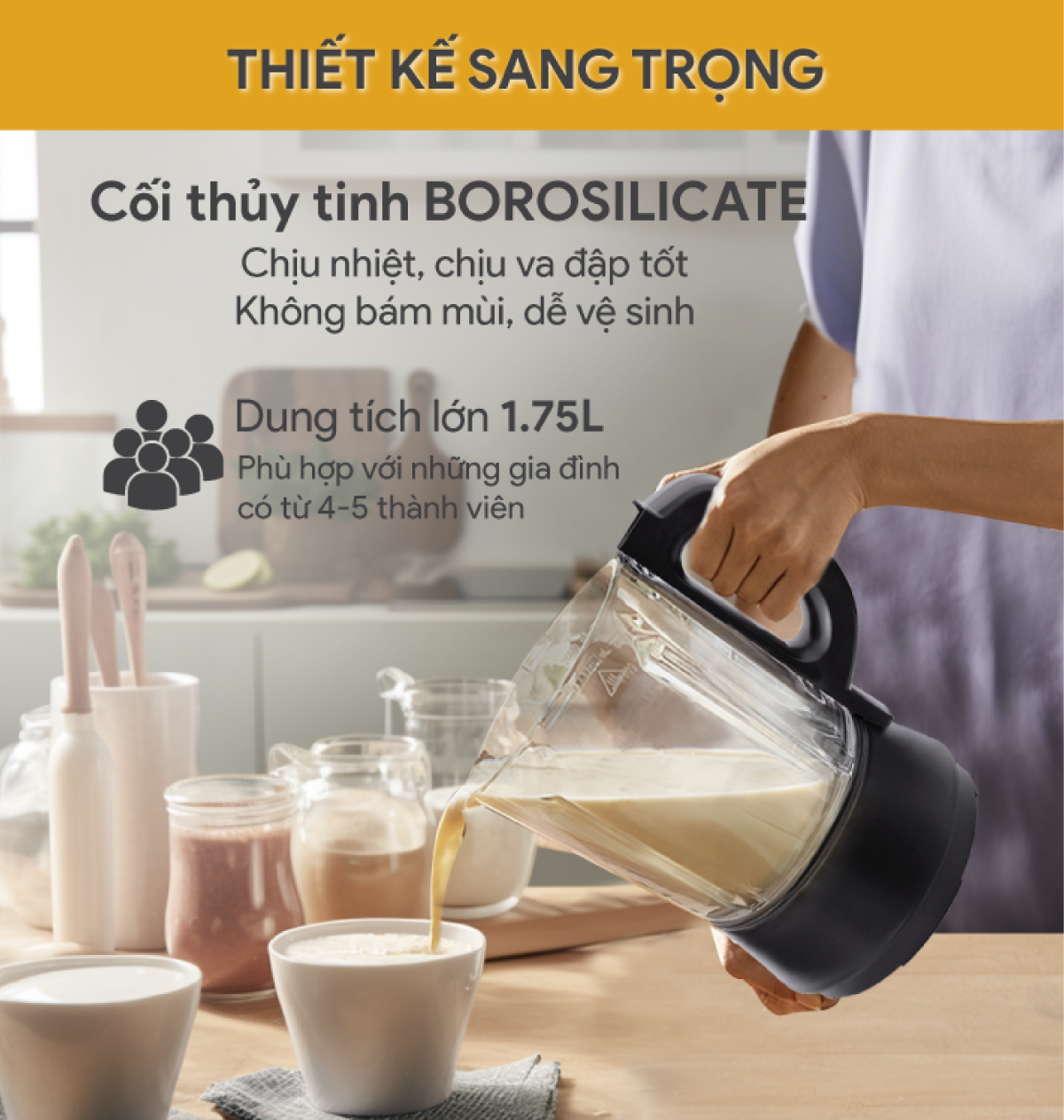 Đặc điểm nổi bật - Máy làm sữa hạt đa năng sử dụng để xay sinh tố, làm sữa hạt các loại, nấu cháo,... - Cối xay thủy tinh cường lực, dung tích 1.75 lít tiện dụng.