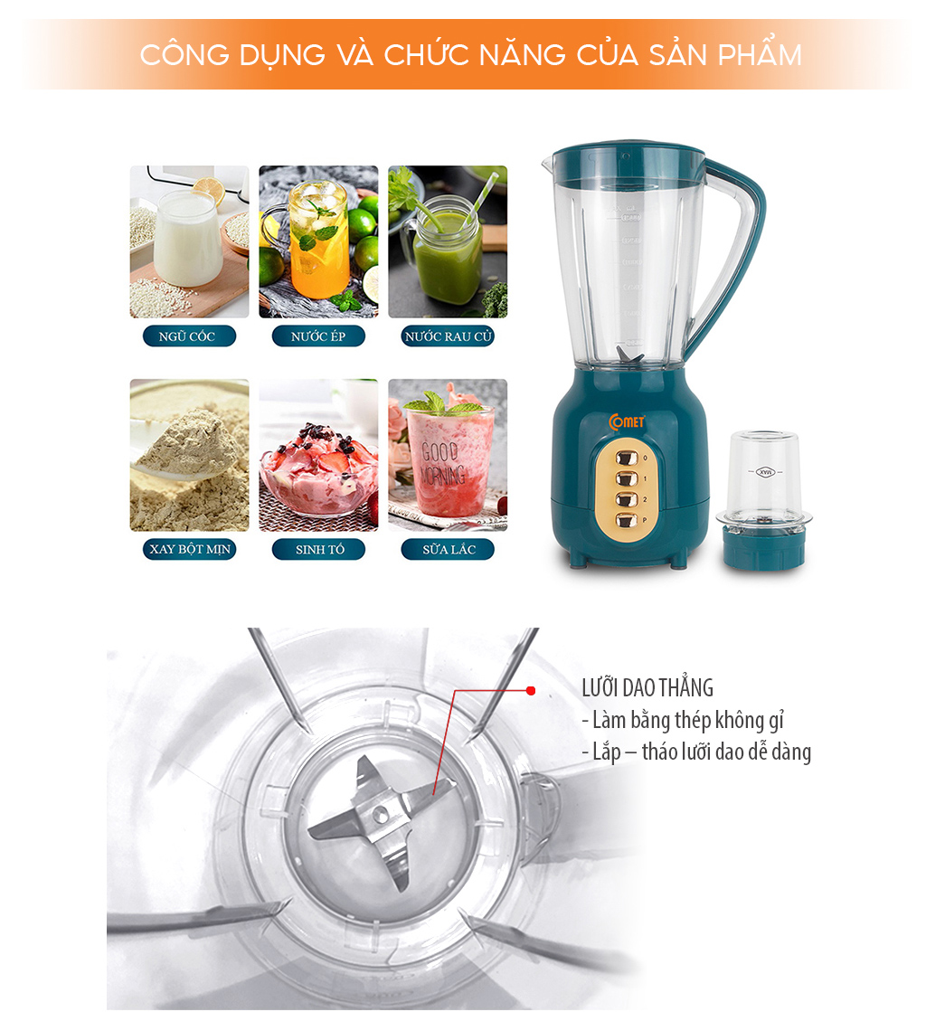 - Máy xay sinh tố Comet CM9955 có kiểu dáng hiện đại, màu sắc trẻ trung, giúp căn bếp trở nên tươi mới hơn bao giờ hết. Công suất mạnh mẽ -