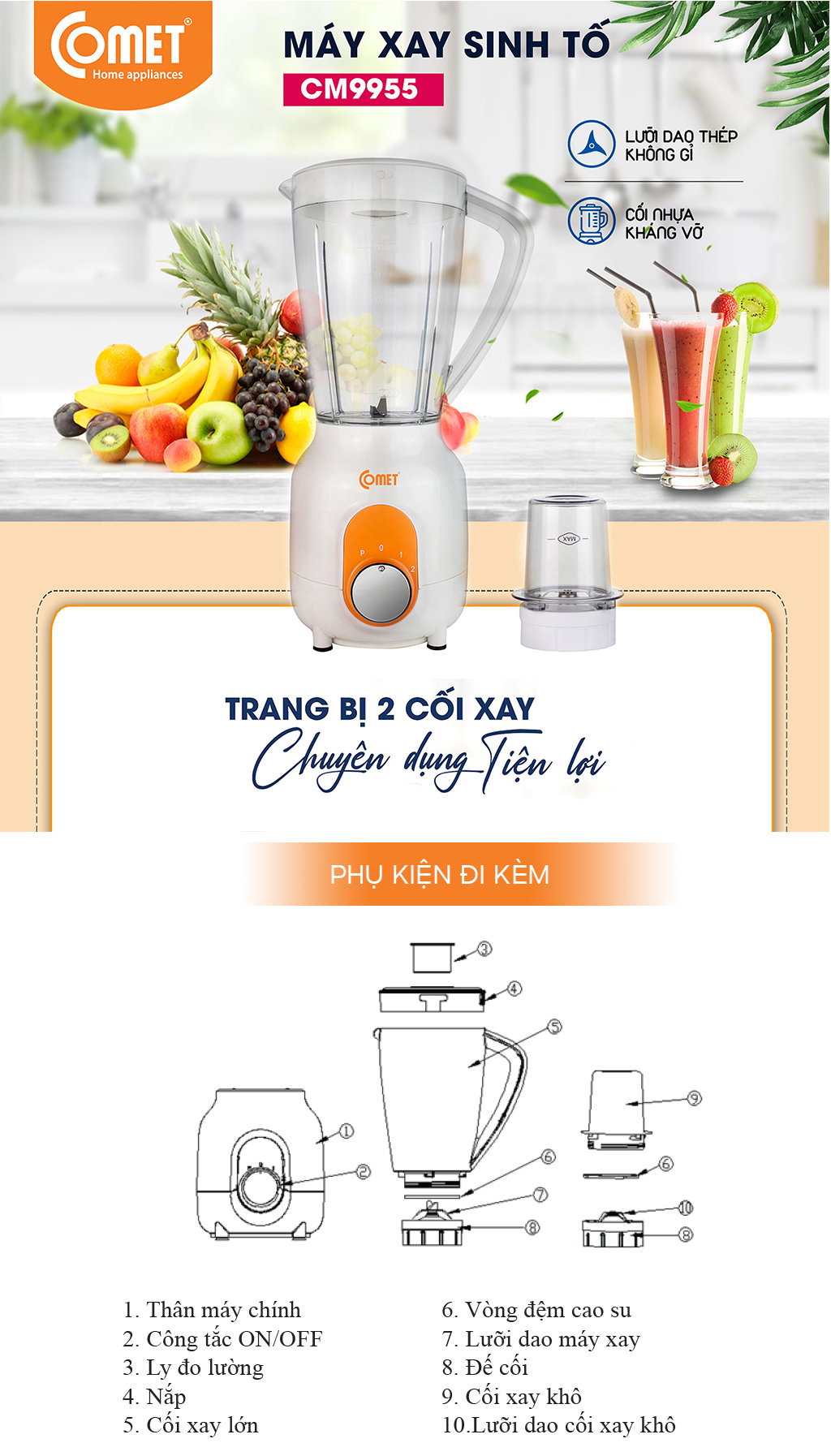 • Máy xay sinh tố Comet CM9955 có kiểu dáng hiện đại, màu sắc trẻ trung, giúp căn bếp trở nên tươi mới hơn bao giờ hết.
