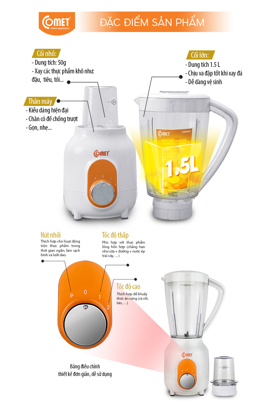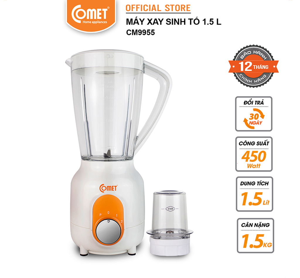 ✨Máy xay sinh tố Comet CM9955 – 2 cối nhựa kháng vỡ, dung tích 1.5L – Công suất 450W, lưỡi dao thép không gỉ – Hàng chính hãng, bảo hành 1 năm