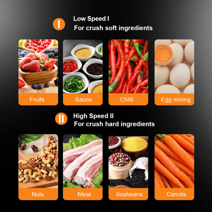 - Tùy chọn hai tốc độ Cao / Thấp cho nhiều loại nguyên liệu khác nhau.