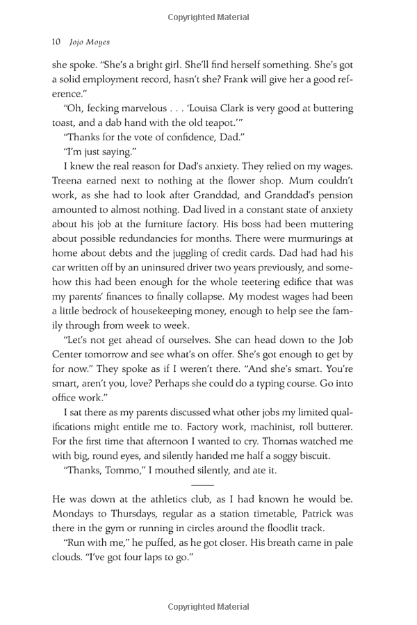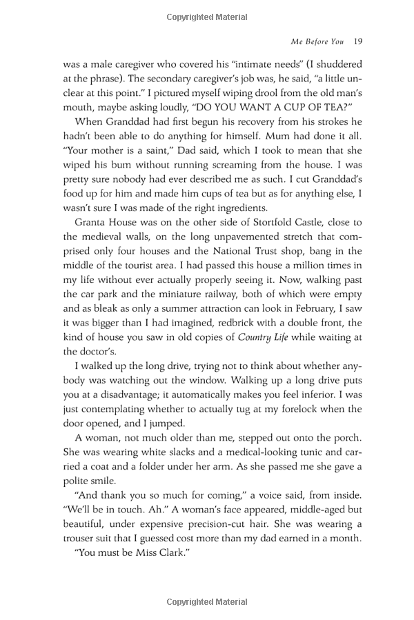 Will is acerbic, moody, bossy-but Lou refuses to treat him with kid gloves, and soon his happiness means more to her than she expected. When she learns that Will has shocking plans of his own, she sets out to show him that life is still worth living.