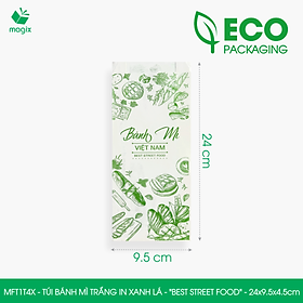 • MFT1T4X - Túi bánh mì trắng in xanh lá - "Best street food" - 24x9.5x4.5 cm