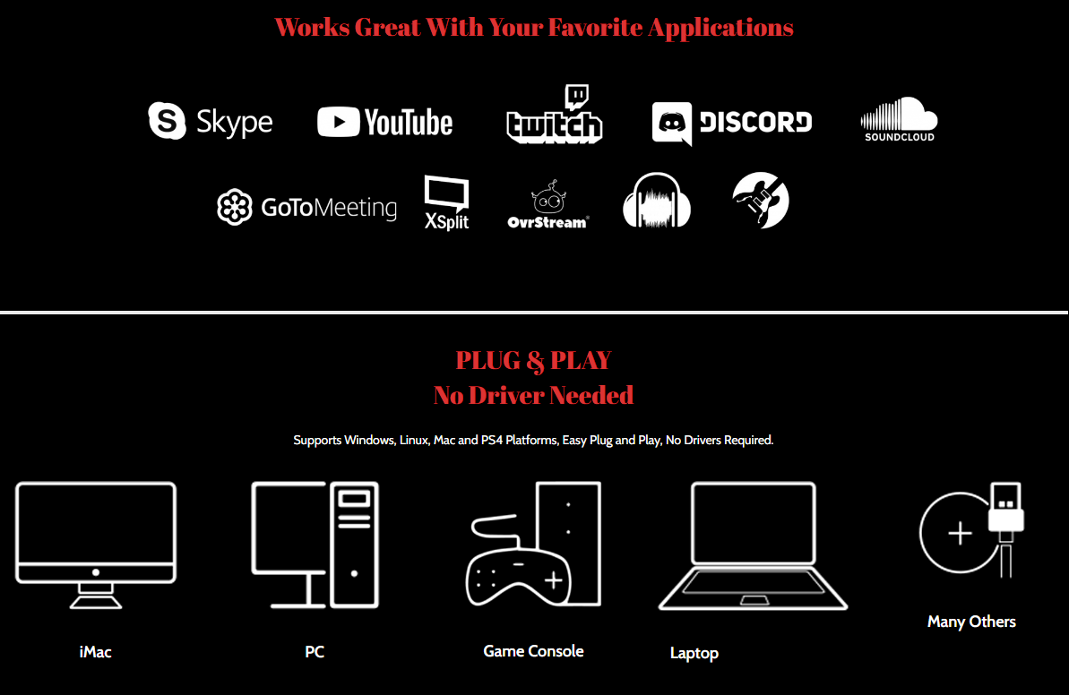 • Hoàn hảo để phát trực tuyến Twitch, podcasting, thuyết minh, phỏng vấn, cuộc gọi Skype / VoIP và ghi âm nhạc