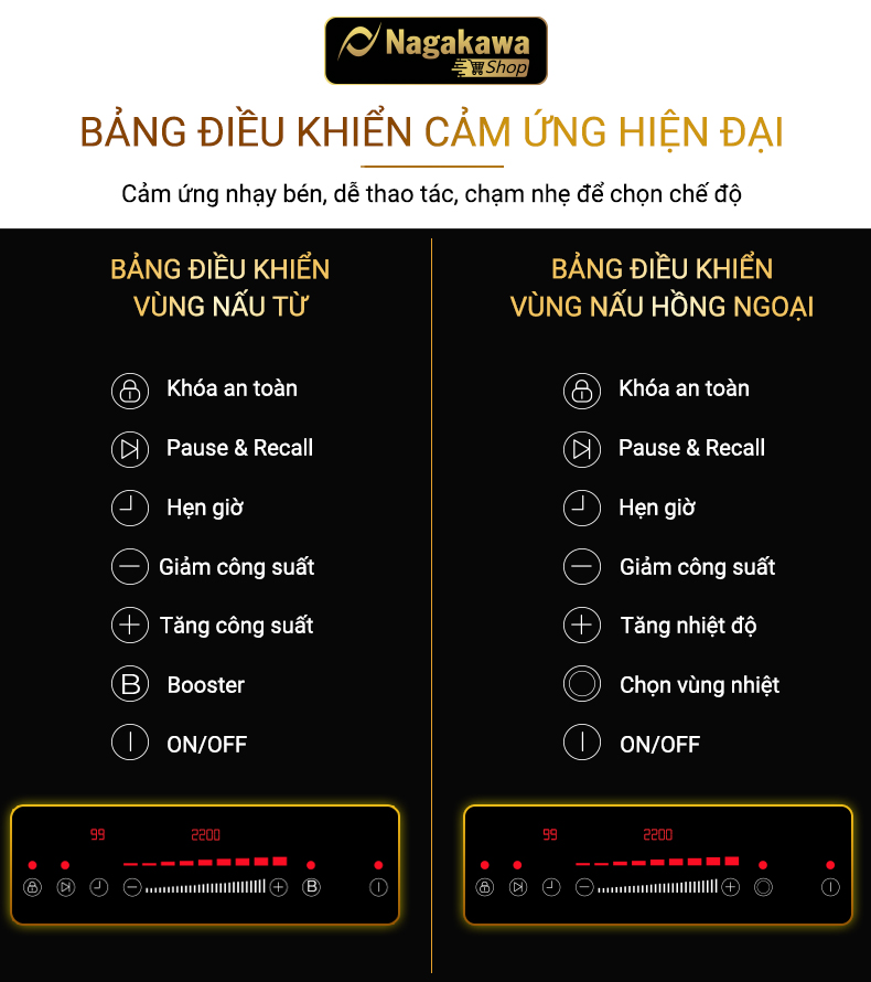 Đặc điểm nổi bật Bếp được tích hợp chức năng NaSYNC - Tự động kết nối điều khiển máy hút mùi nagakawa - Mỏng hơn 30% tiết kiệm không gian tủ bếp - Vật liệu