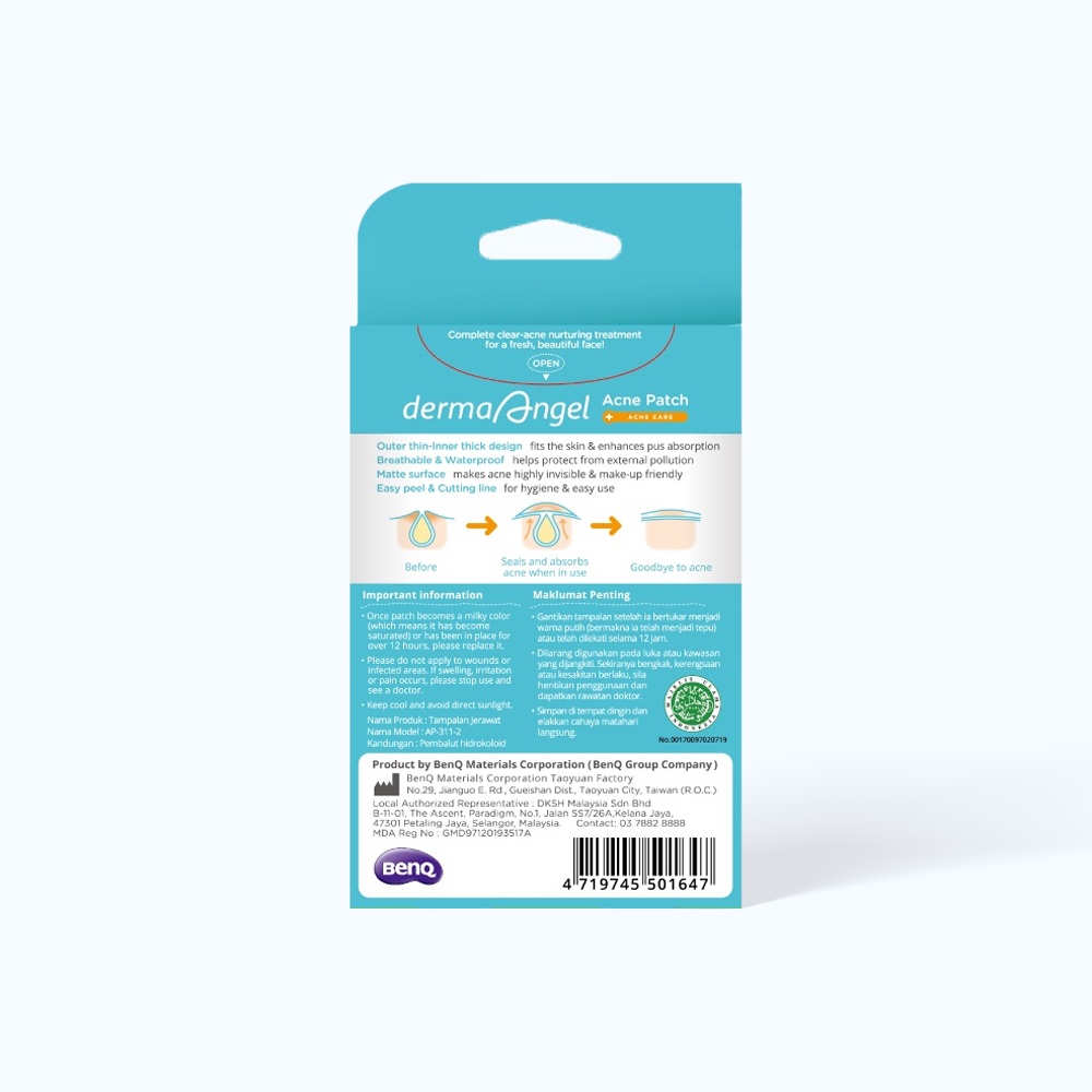 Thành phần Hydrocolloid   Công dụng Giữ vệ sinh, thấm dầu nhờn, hút mụn mủ, hạn chế sẹo thâm cho vùng mụn   Hướng dẫn sử dụng: Vệ sinh vùng mụn, rửa tay sạch và lau khô Lấy miếng dán và xe theo đường cắt của miếng dán Dán miếng dán vào giữa mụn và tháo phần còn lại của miếng dán Ấn nhẹ miếng dán từ 3-5 giây để tăng độ dính của miếng dán Dán miếng dán mụn trước khi trang điểm   Lưu ý: Miếng dán đổi sang màu trắng khi hút mủ. Thay miếng dán mới khi sản phẩm đổi màu trắng đục hoặc sau 12 tiếng. Tiếp tục sử dụng miếng dán cho đến khi vết thương hoàn toàn hồi phục.   Bảo quản: Nơi khô ráo và thoáng mát ở nhiệt độ phòng   Quy cách đóng gói: Hộp 12 miếng ban ngày   Xuất xứ thương hiệu: DermaAngel   Sản xuất tại: Đài Loan   Tên nhà sản xuất: BenQ Materials Corporation   *Pharmacity cam kết chỉ bán sản phẩm còn dài hạn sử dụng.