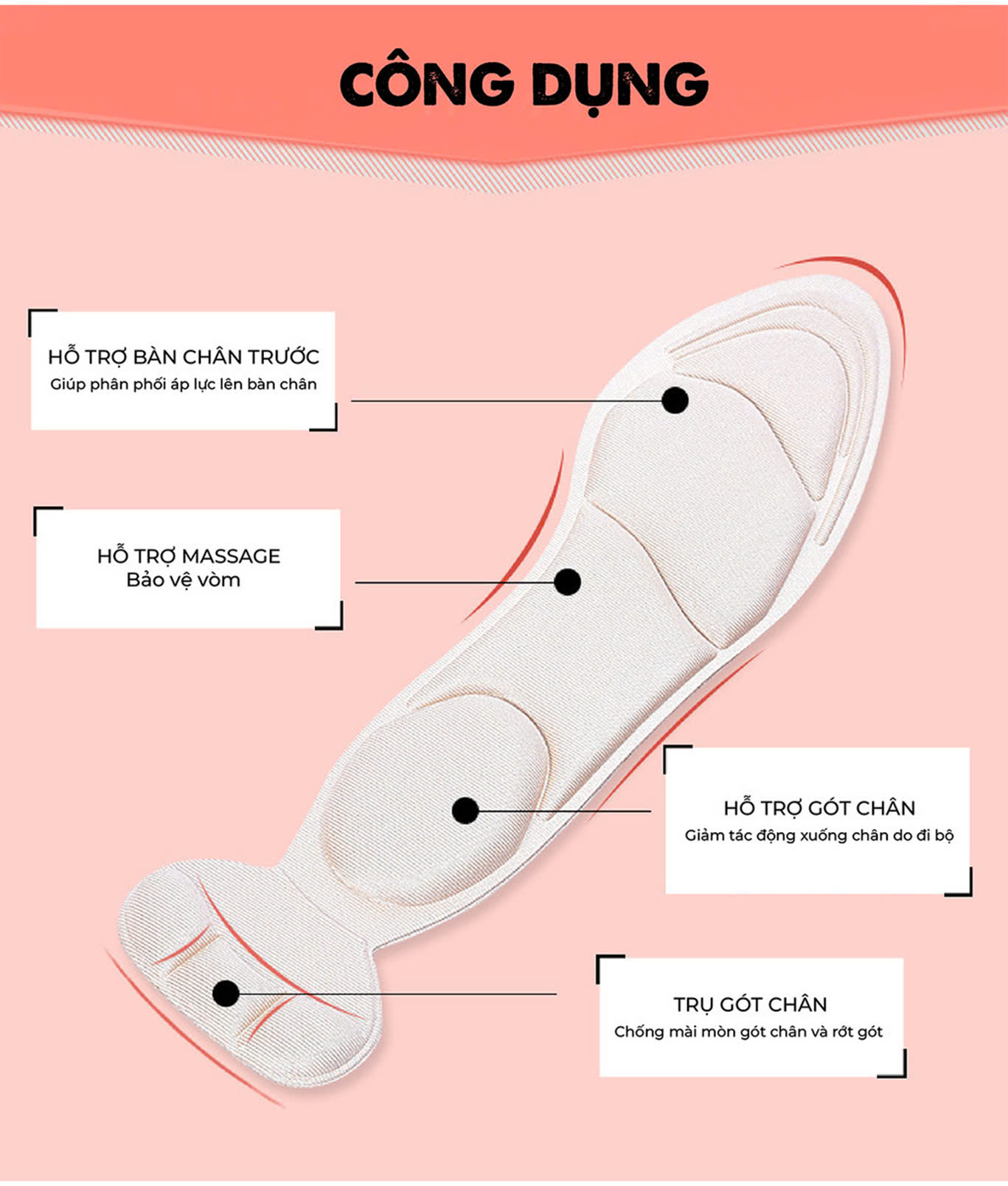 - Công dụng: miếng lót giúp giảm size giày bị rộng, chống trầy gót chân, giảm đau gang bàn chân và giảm thốn gót chân khi phải đi đứng trên giày cao gót hoặc khi mang giày bị rộng