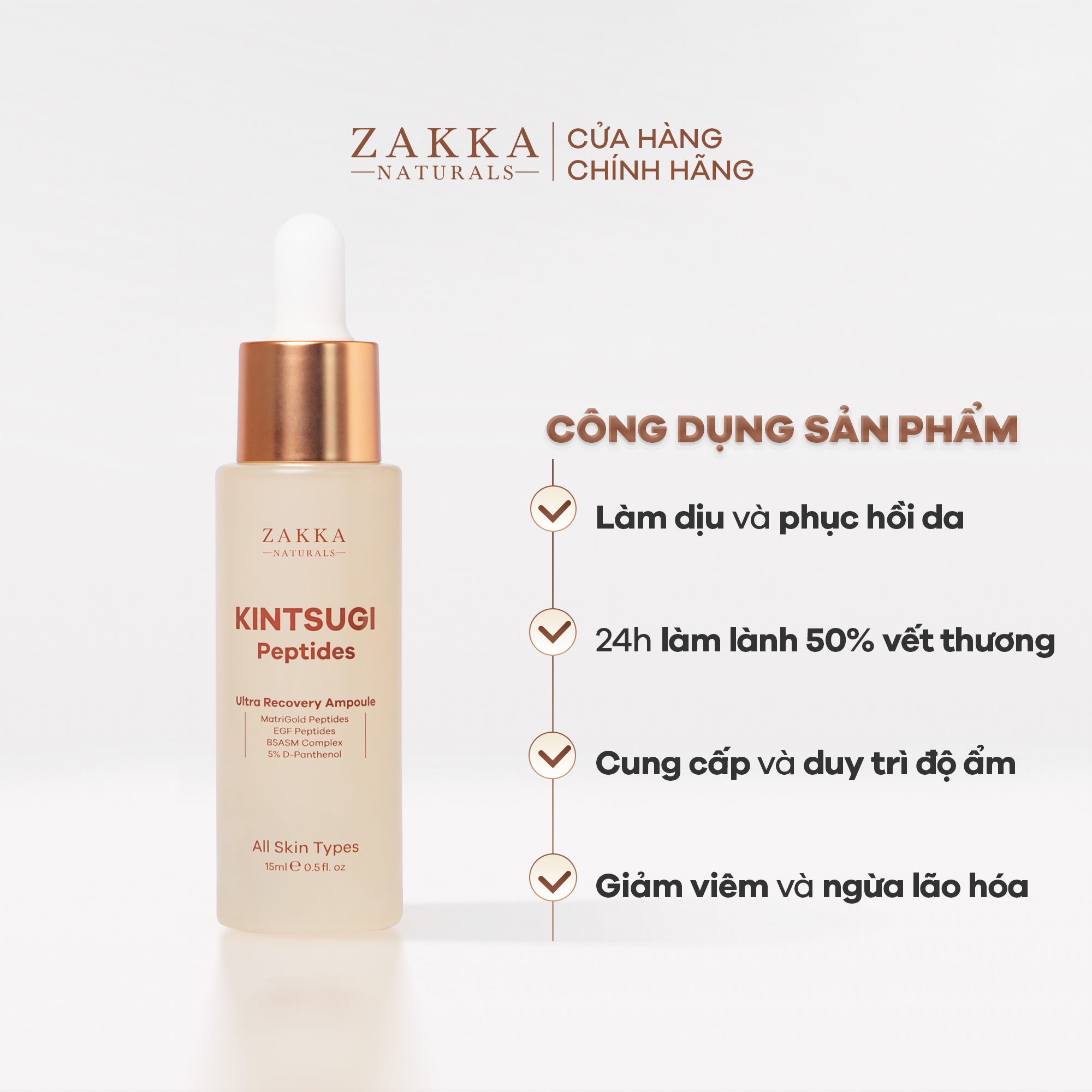Tinh Chất Phục Hồi Độ ẩm Chuyên Sâu & Lành Tổn Thương Zakka Naturals Kintsugi Peptides Ultra Recovery Ampoule. Trong đó, 5 loại HA đa tầng giúp dưỡng ẩm khắp các tầng da và hỗ trợ phục hồi. Da được cải thiện và tái tạo nhanh chóng để làm lành vết thương nhờ các lợi ích của 6 loại peptides. Cùng với 8 loại chiết xuất thực vật hỗ trợ làm dịu ngay tức thì, và giảm viêm. 7 loại amino acids cấp ẩm và duy trì độ ẩm sâu trong da , đồng thời giúp quá trình phục hồi và làm lành da bị tổn thương diễn ra nhanh hơn.